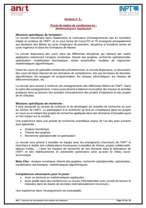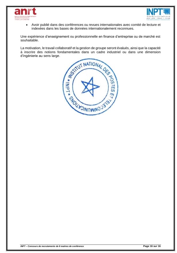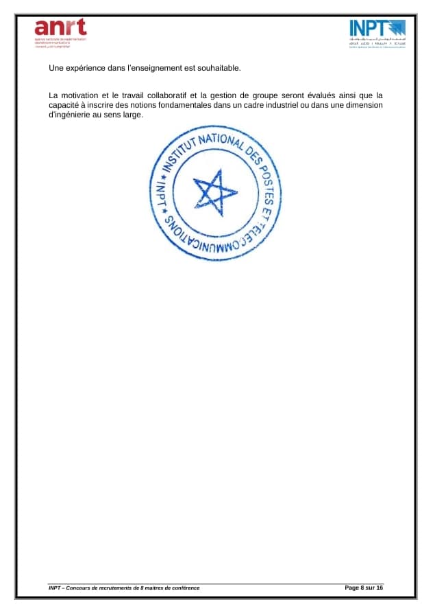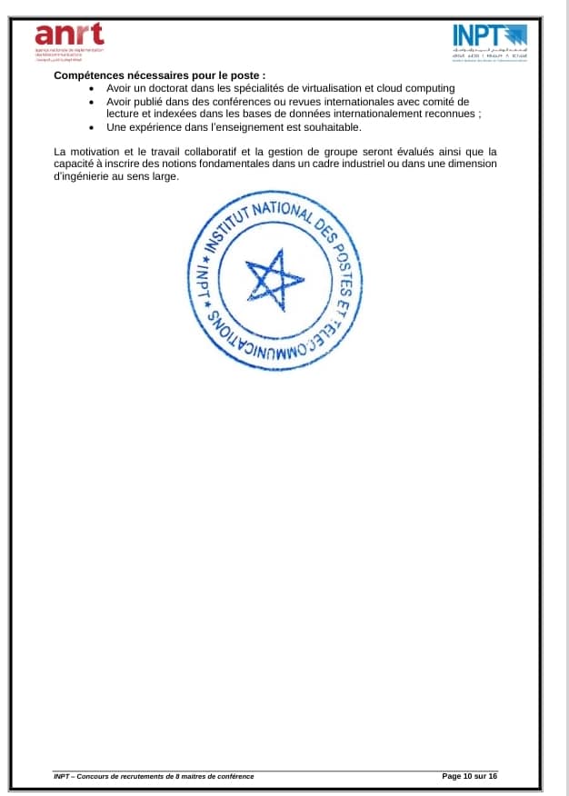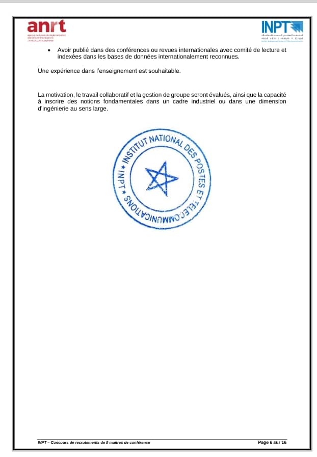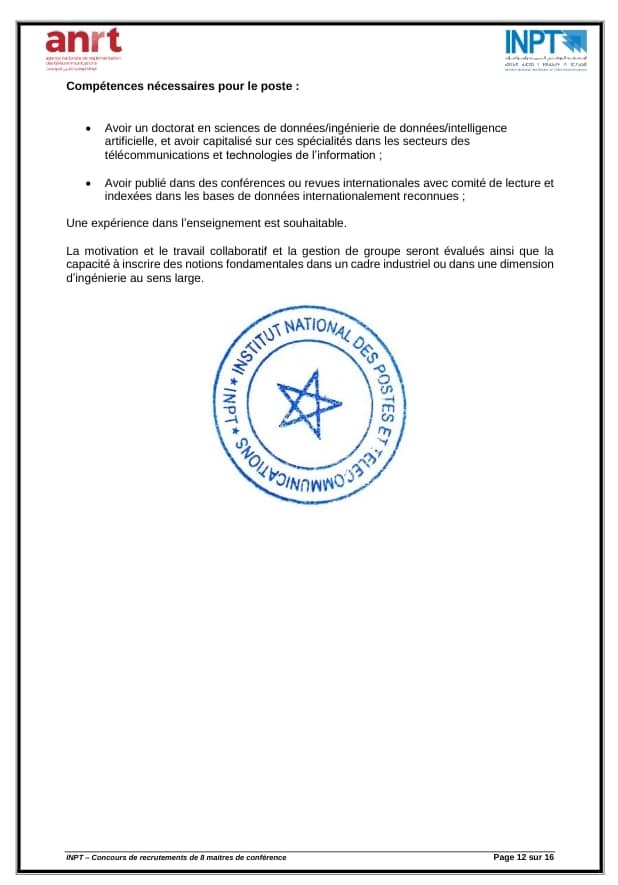 L’Institut National des Postes et Télécommunications (INPT) organise un concours pour le recrutement de (8) Maîtres de Conférences.