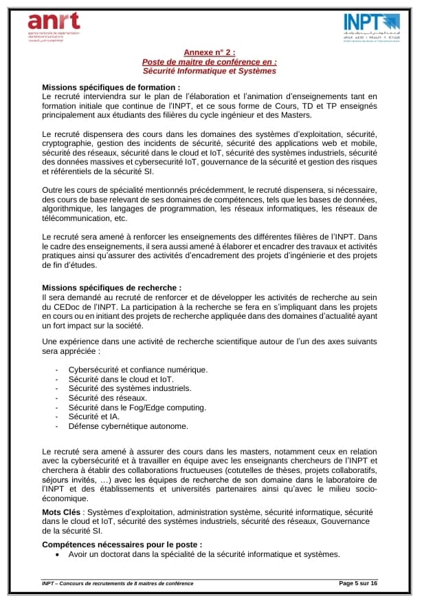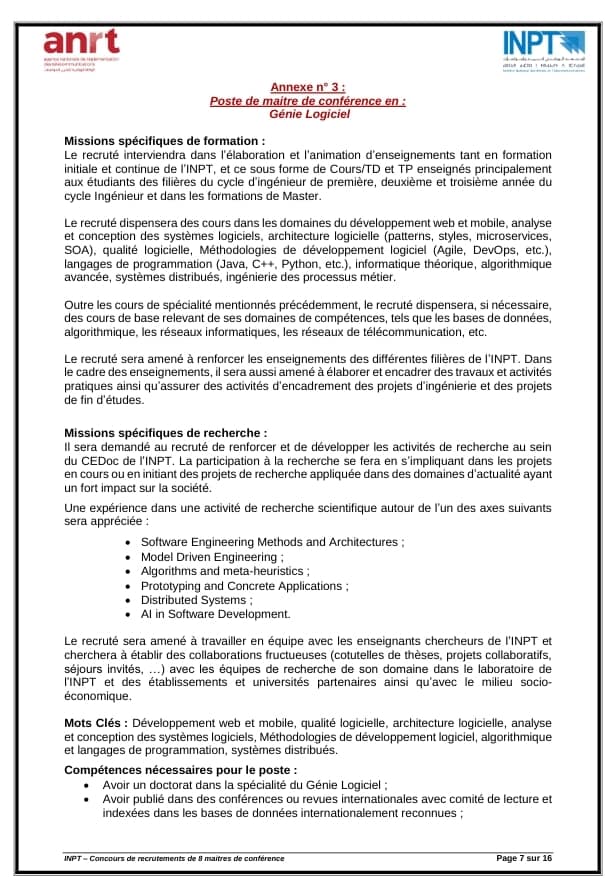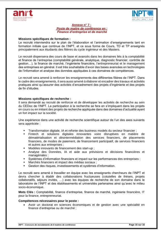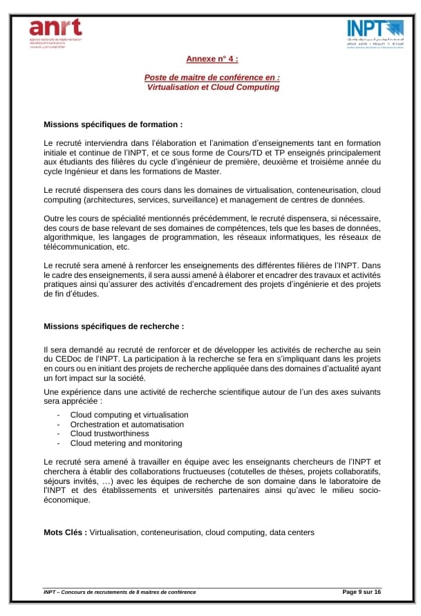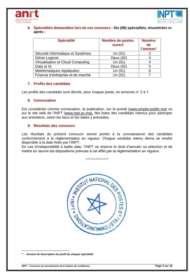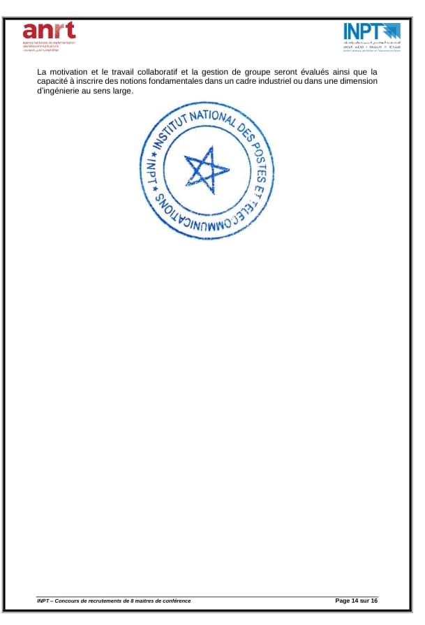 L’Institut National des Postes et Télécommunications (INPT) organise un concours pour le recrutement de (8) Maîtres de Conférences.
