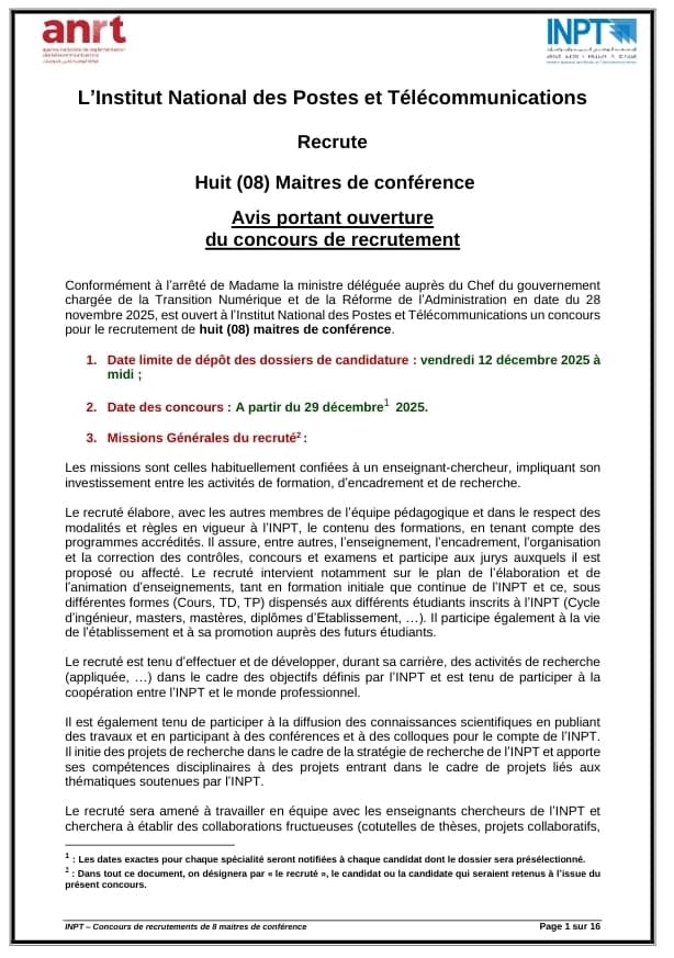 المعهد الوطني للبريد والمواصلات: مباراة توظيف (08) أساتذة محاضرين من الدرجة الاولي، آخر أجل هو 12 دجنبر 2025