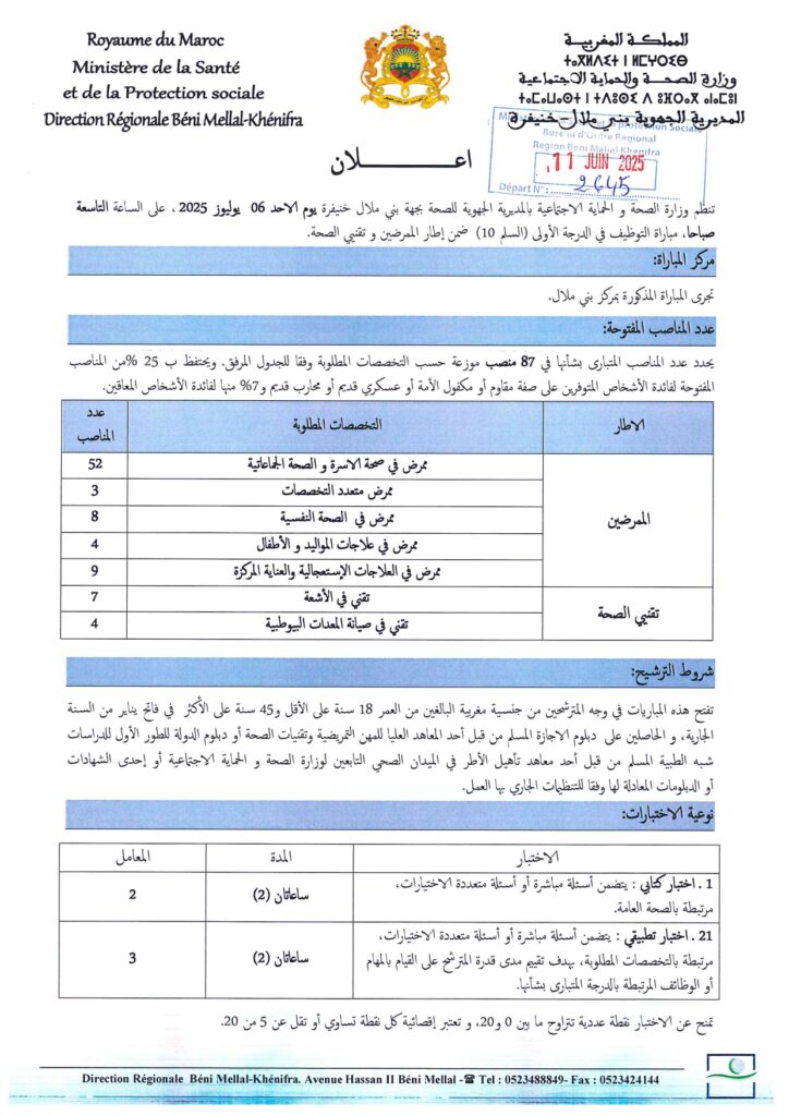 تعلن المديرية الجهوية للصحة لجهة بني ملال خنيفرة عن مباراة توظيف 87 منصب، آخر أجل 27 يونيو 2025
