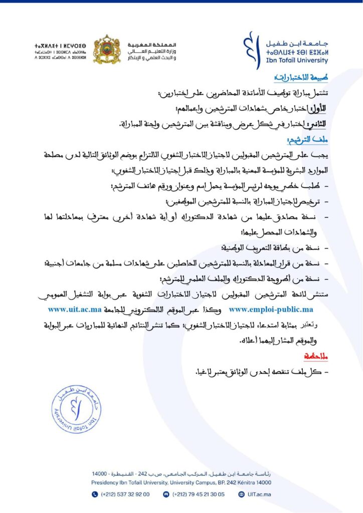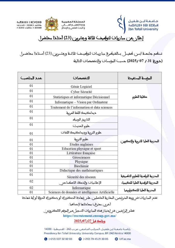 تعلن جامعة ابن طفيل القنيطرة عن مباراة توظيف 23 أستاذ محاضر بتخصصات مختلفة آخر أجل هو 26 يوليوز 2025