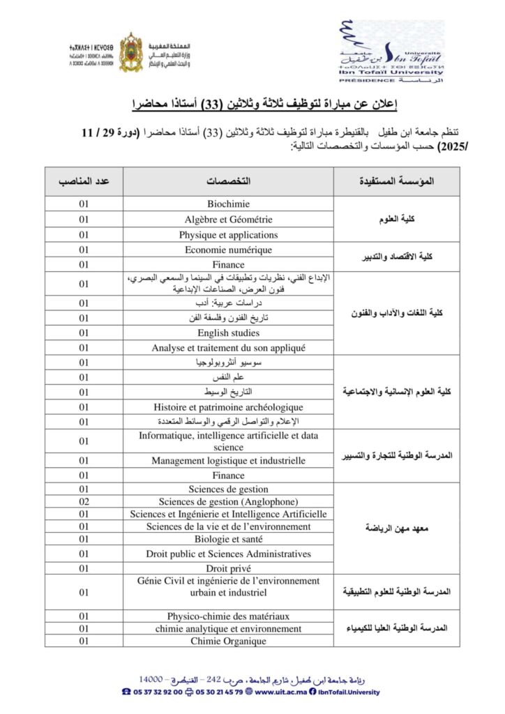تعلن جامعة ابن طفيل القنيطرة عن مباراة توظيف 33 أستاذ محاضر، آخر أجل هو 25 نونبر 2025