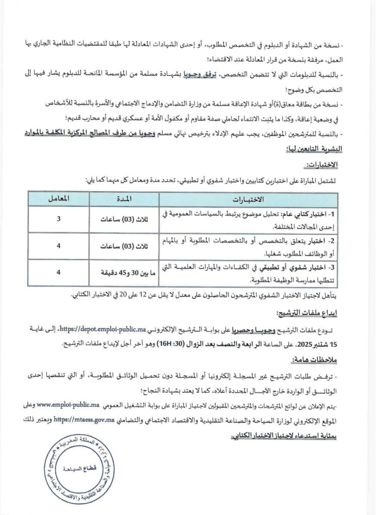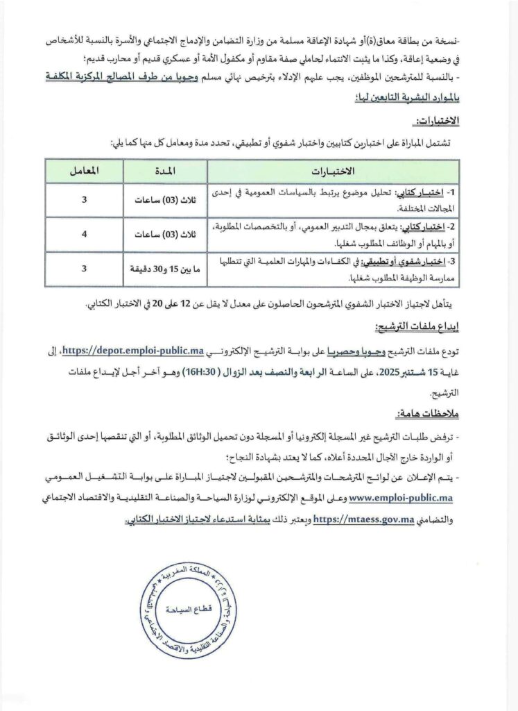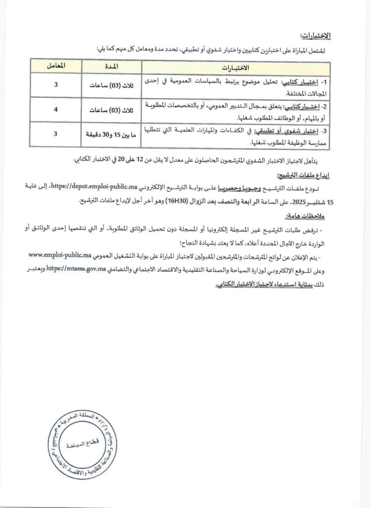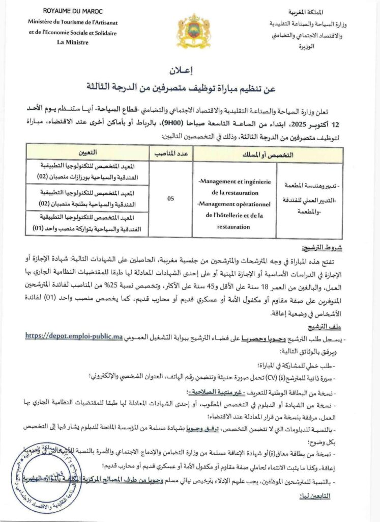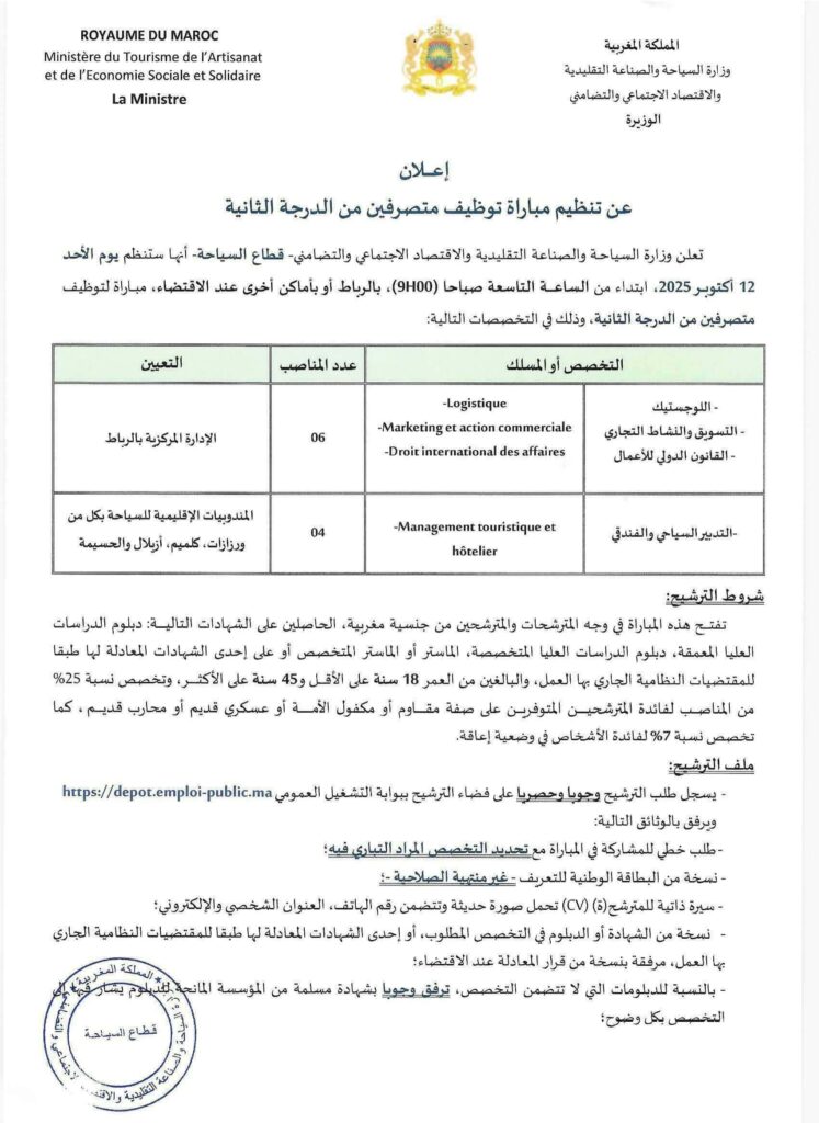 Le Ministère du Tourisme, de l’Artisanat et de l’Economie sociale et solidaire, Département du Tourisme organise un concours pour le recrutement 29 postes répartis comme suit:
