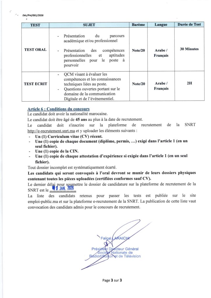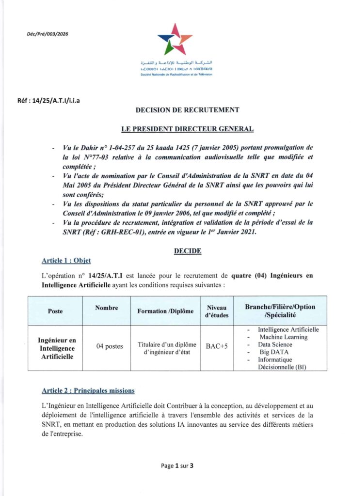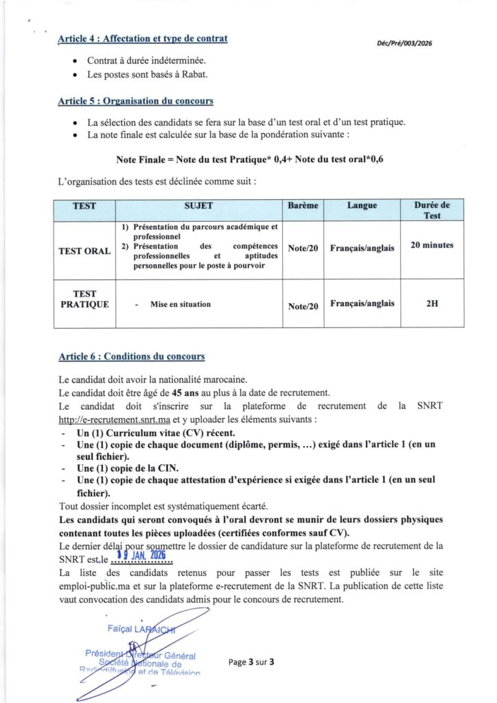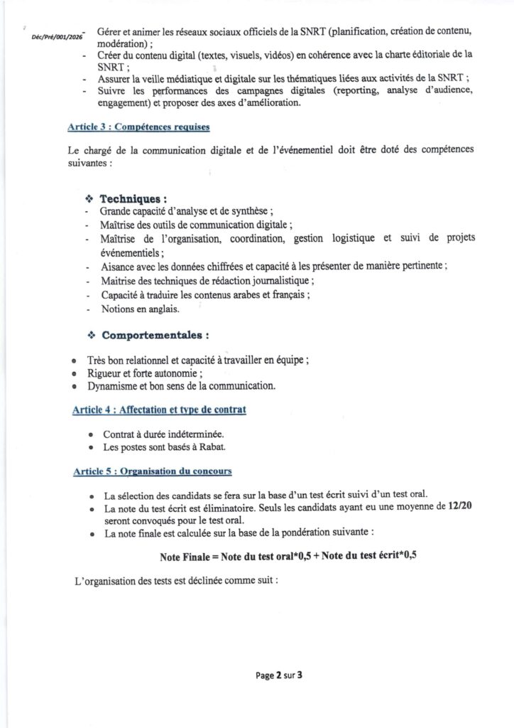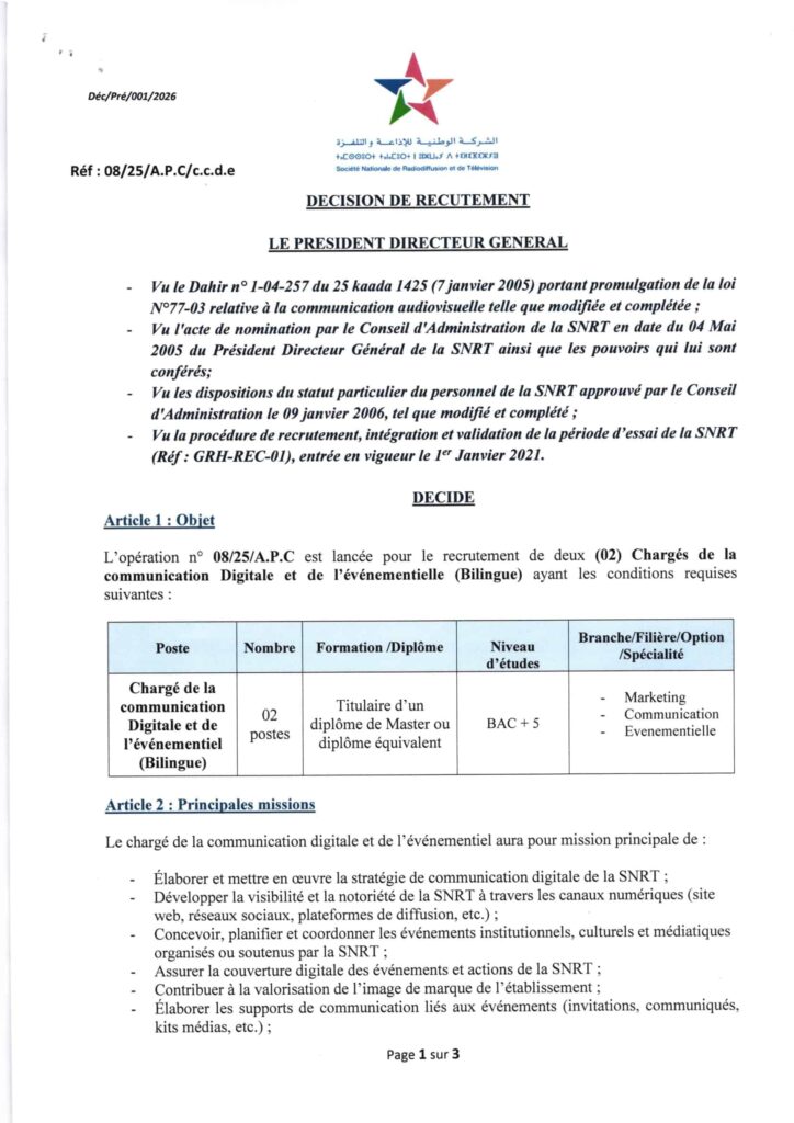 La Société Nationale de Radiodiffusion et de Télévision SNRT lance un concours visant à recruter 6 postes répartis comme suit: