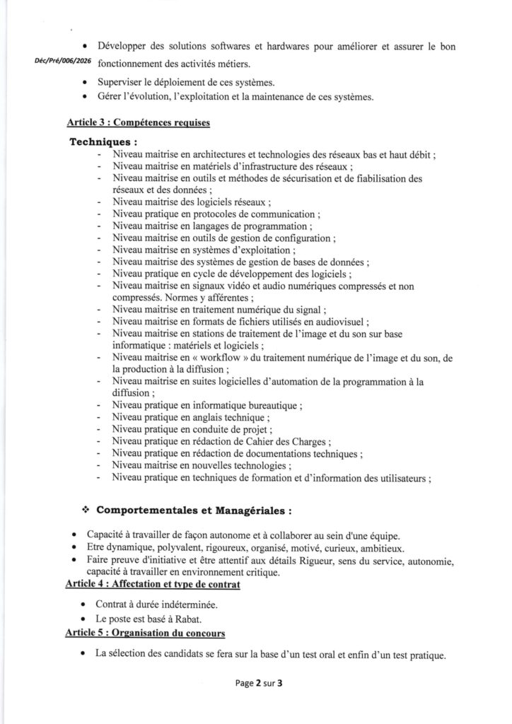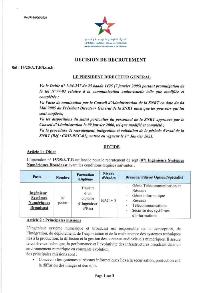 La Société Nationale de Radiodiffusion et de Télévision SNRT lance un concours visant à recruter (7) Ingénieurs Systèmes Numériques Broadcast.
