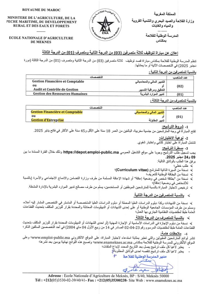 تنظم المدرسة الوطنية للفلاحة بمكناس مباراة توظيف 12 منصب -(Bac+2/3/5)،آخر أجل لإيداع الترشيحات 24 دجنبر 2025
