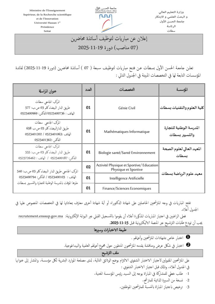 Université Hassan 1er – Settat: Concours de Recrutement (07) Postes