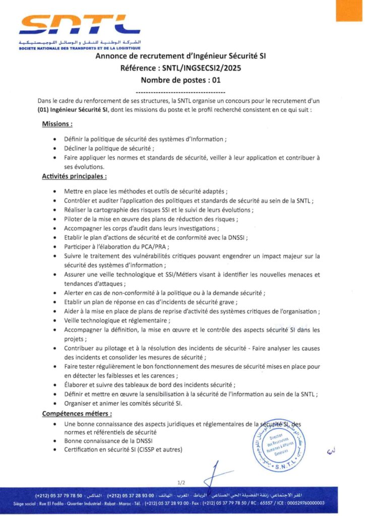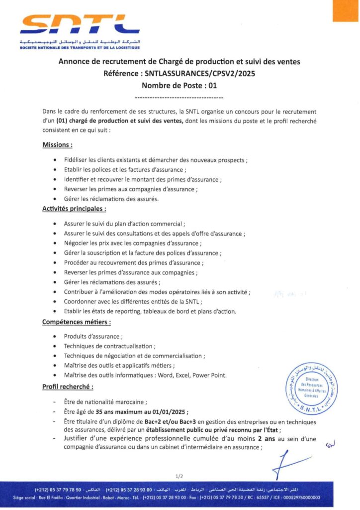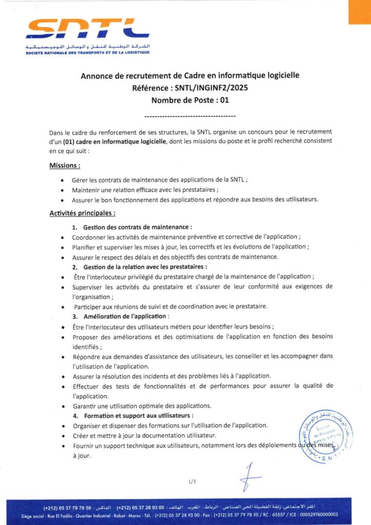 La Société Nationale des Transports et de la Logistique SNTL organise un concours pour le recrutement 3 postes répartis comme suit: