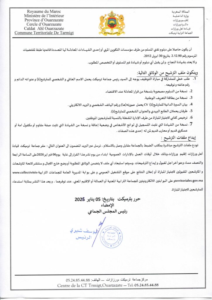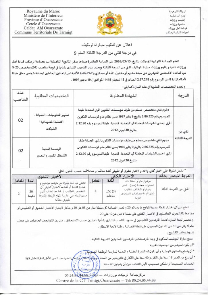 مباراة توظيف 4 تقنيين من الدرجة الثالثة بجماعة ترميكت – إقليم ورزازات، آخر أجل 6 فبراير 2026