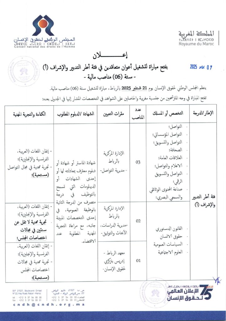 مباراة توظيف 6 أطر التدبير والإشراف الدرجة أ بالمجلس الوطني لحقوق الانسان، آخر أجل 25 يوليوز 2025