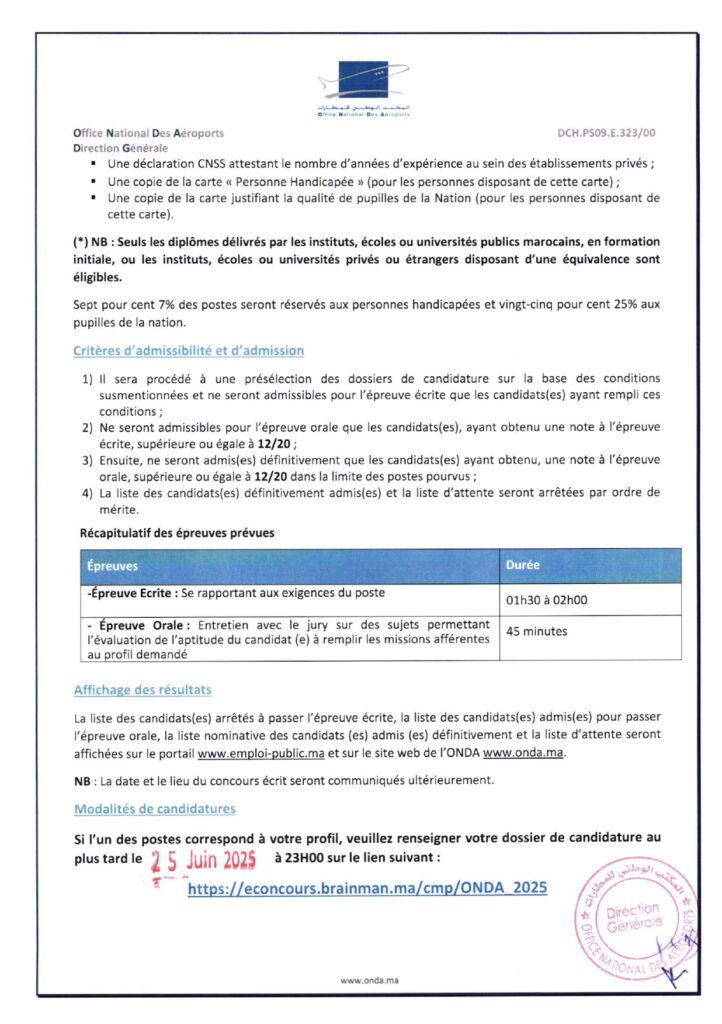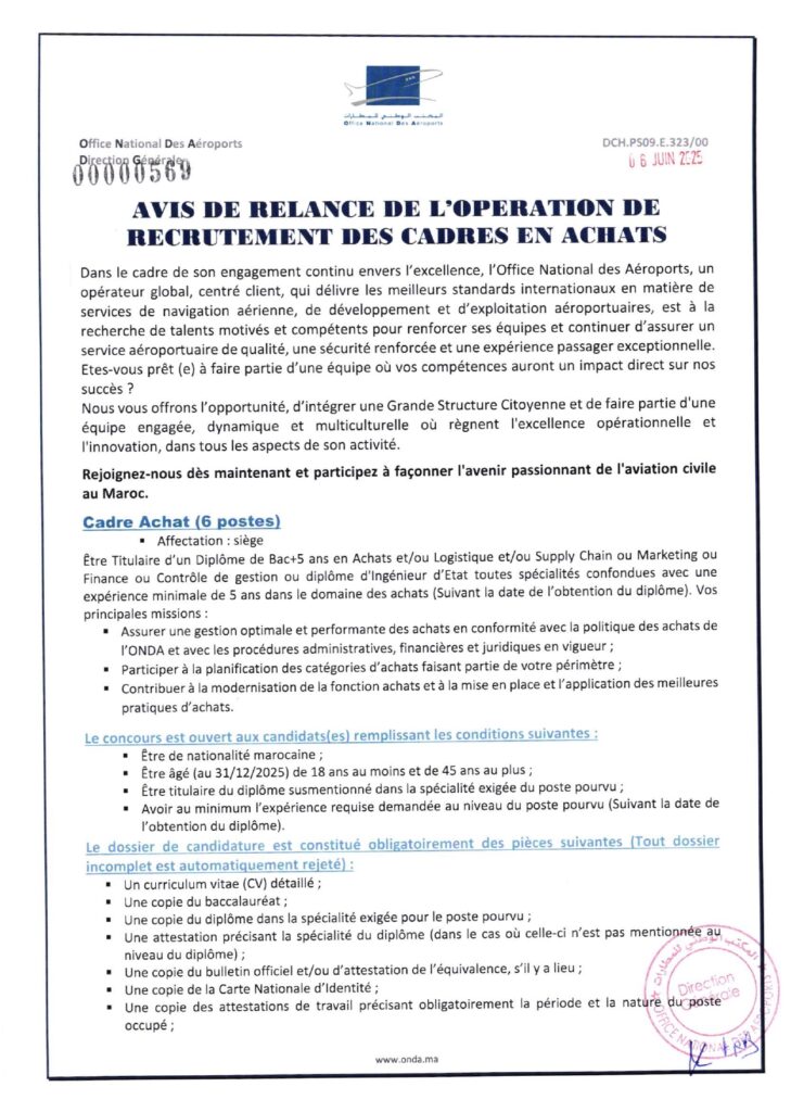 L’Office National Des Aéroports ONDA organise un concours pour le recrutement (06 Postes) Cadre Achat.
