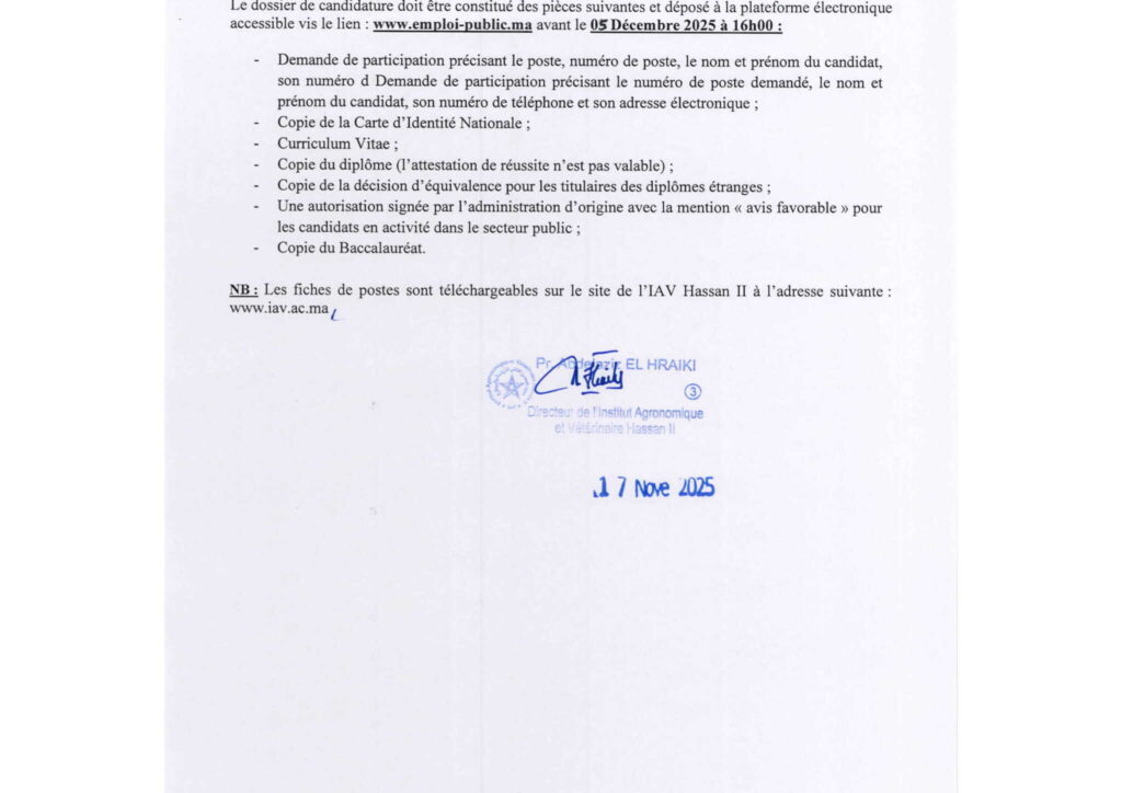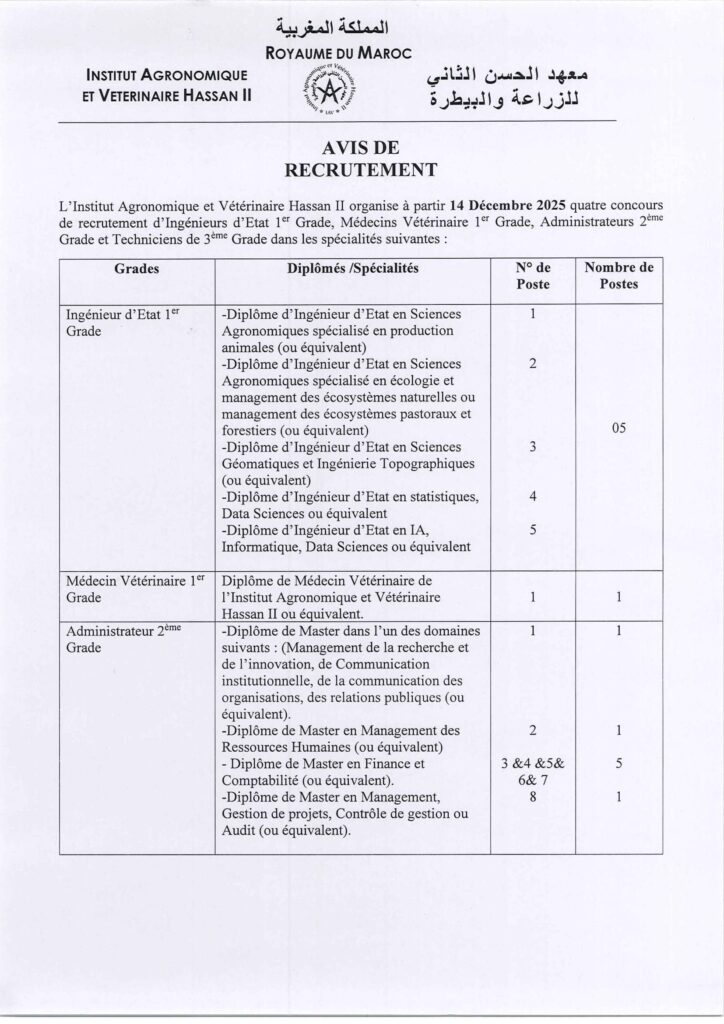 مباراة لتوظيف أطر إدارية وتقنية – (28 منصب) بمعهد الحسن الثاني للزراعة والبيطرة، آخر أجل هو 5 دجنبر 2025