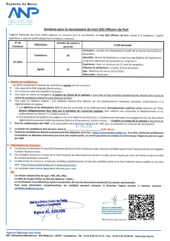 Concours de Recrutement Agence Nationale des Ports 2025 (3 Officiers de Port) à Casablanca et Agadir.