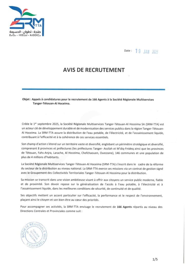 SRM Tanger-Tétouan-Al Hoceima: Concours de recrutement (166 Agents)