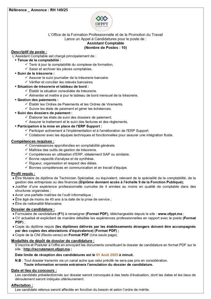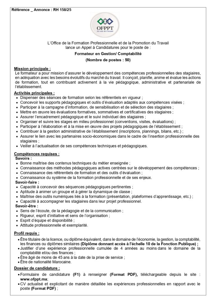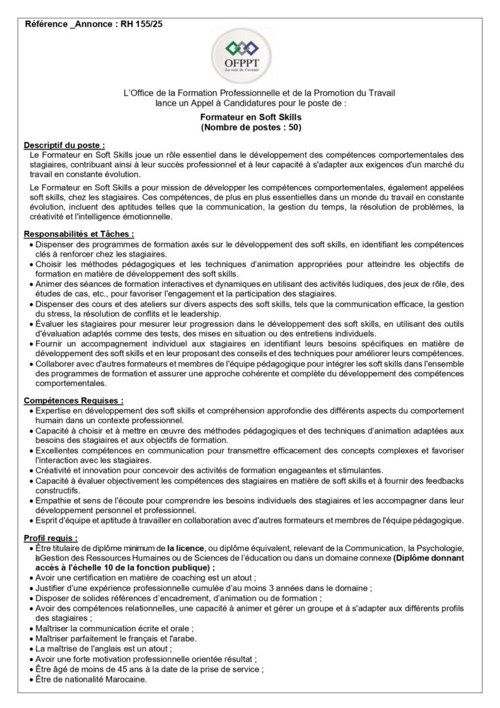 L’Office de la Formation Professionnelle et de la Promotion du Travail (OFPPT) organise un concours pour le recrutement de 245 Postes.