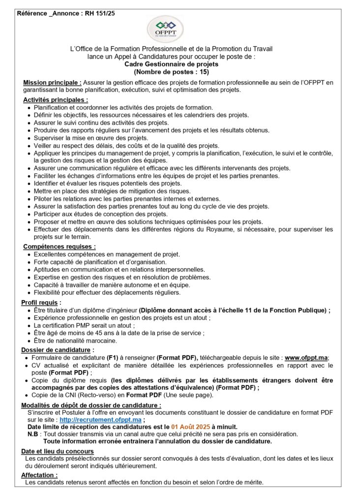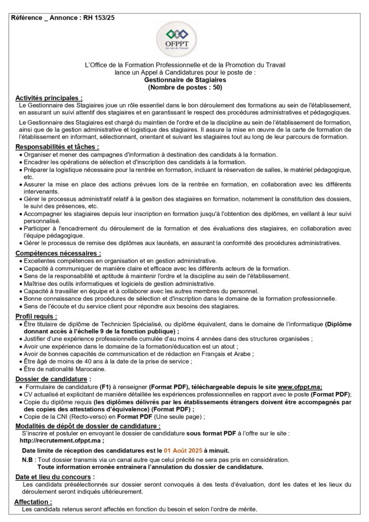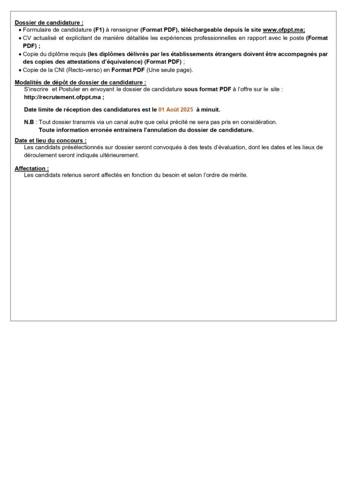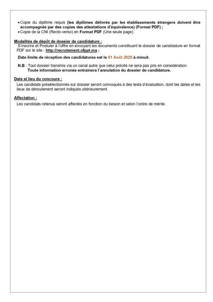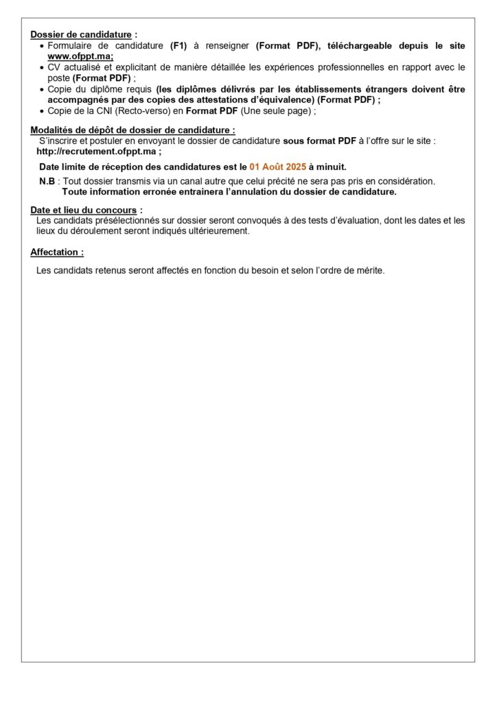 La date limite de dépôt des candidatures est fixée au 01 Aout 2025.