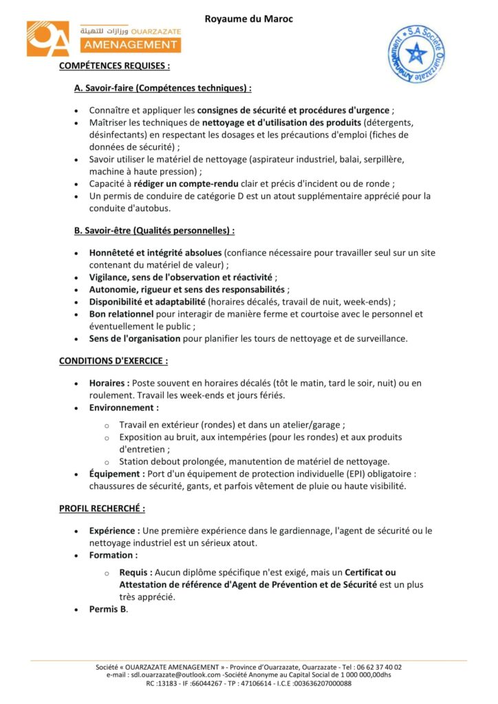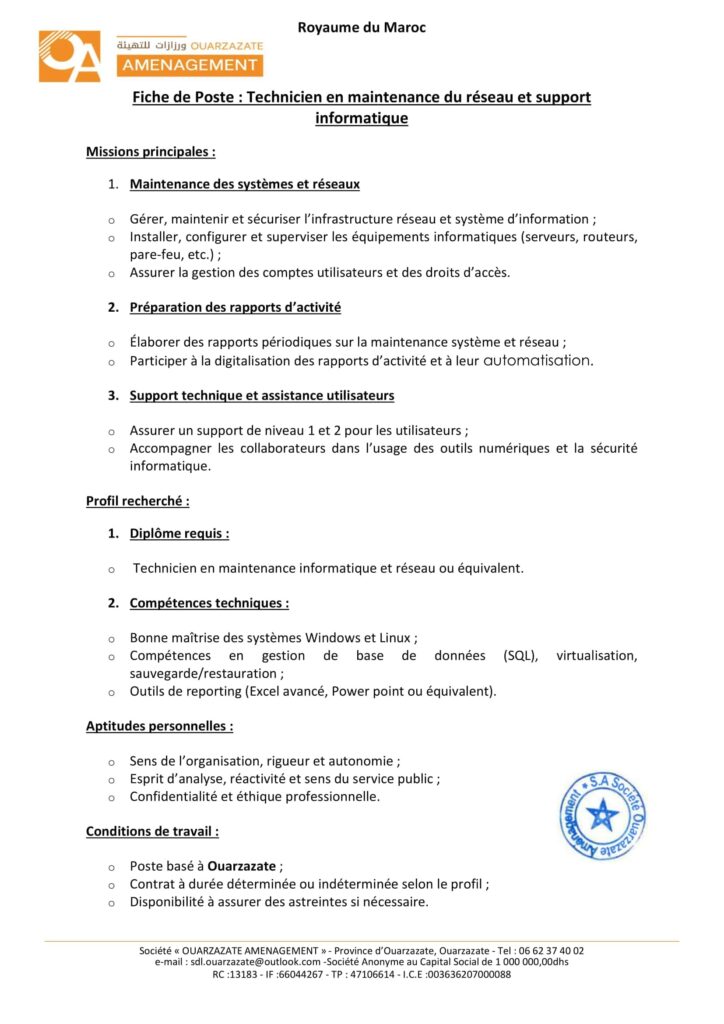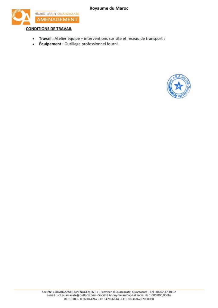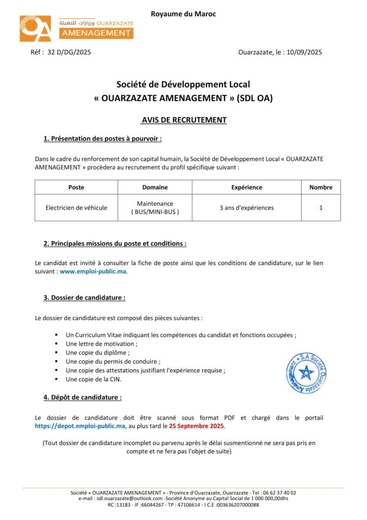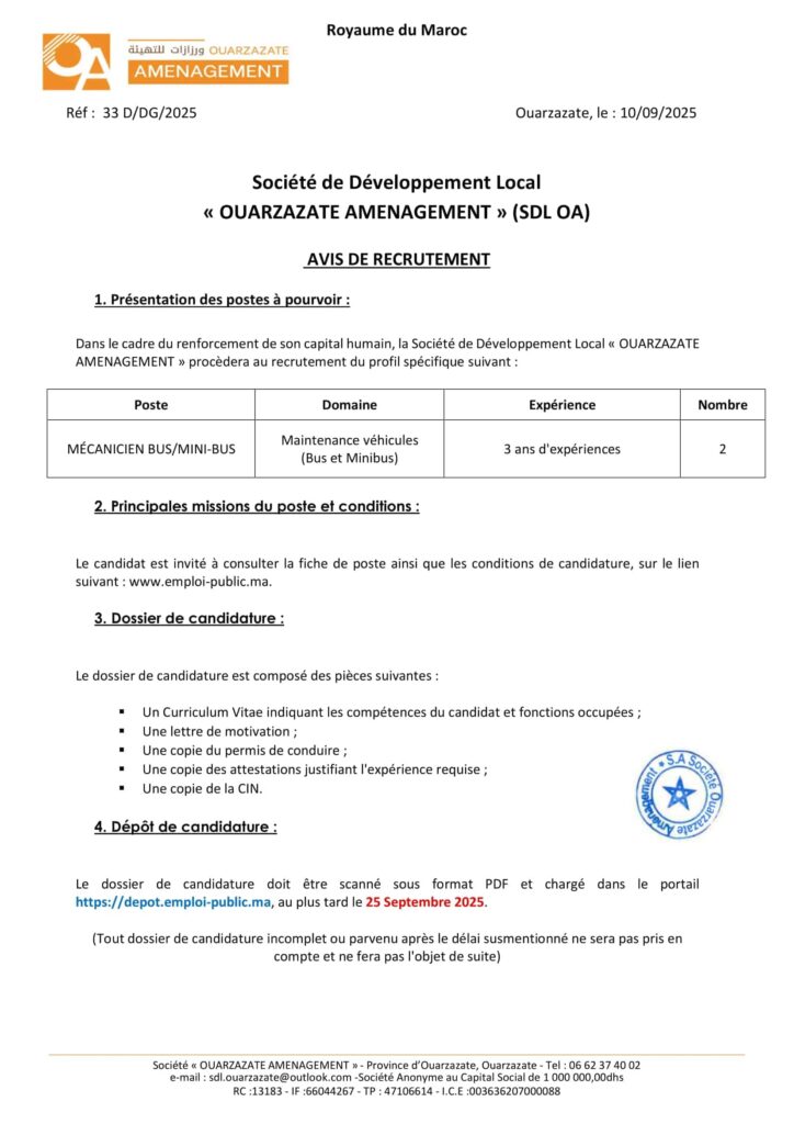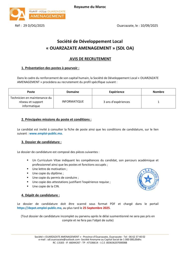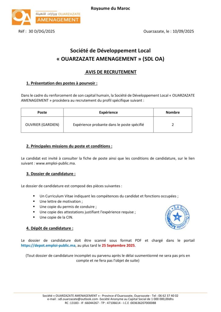 La Société de Développement Local «Ouarzazate Aménagement» organise un concours pour le recrutement de 8 postes répartis comme suit: